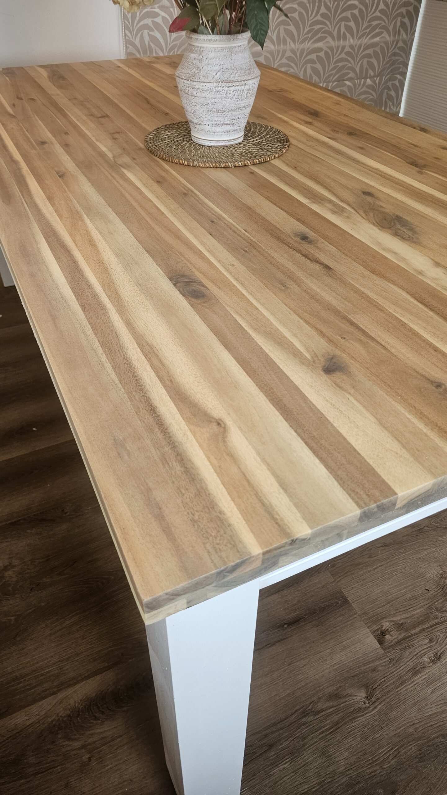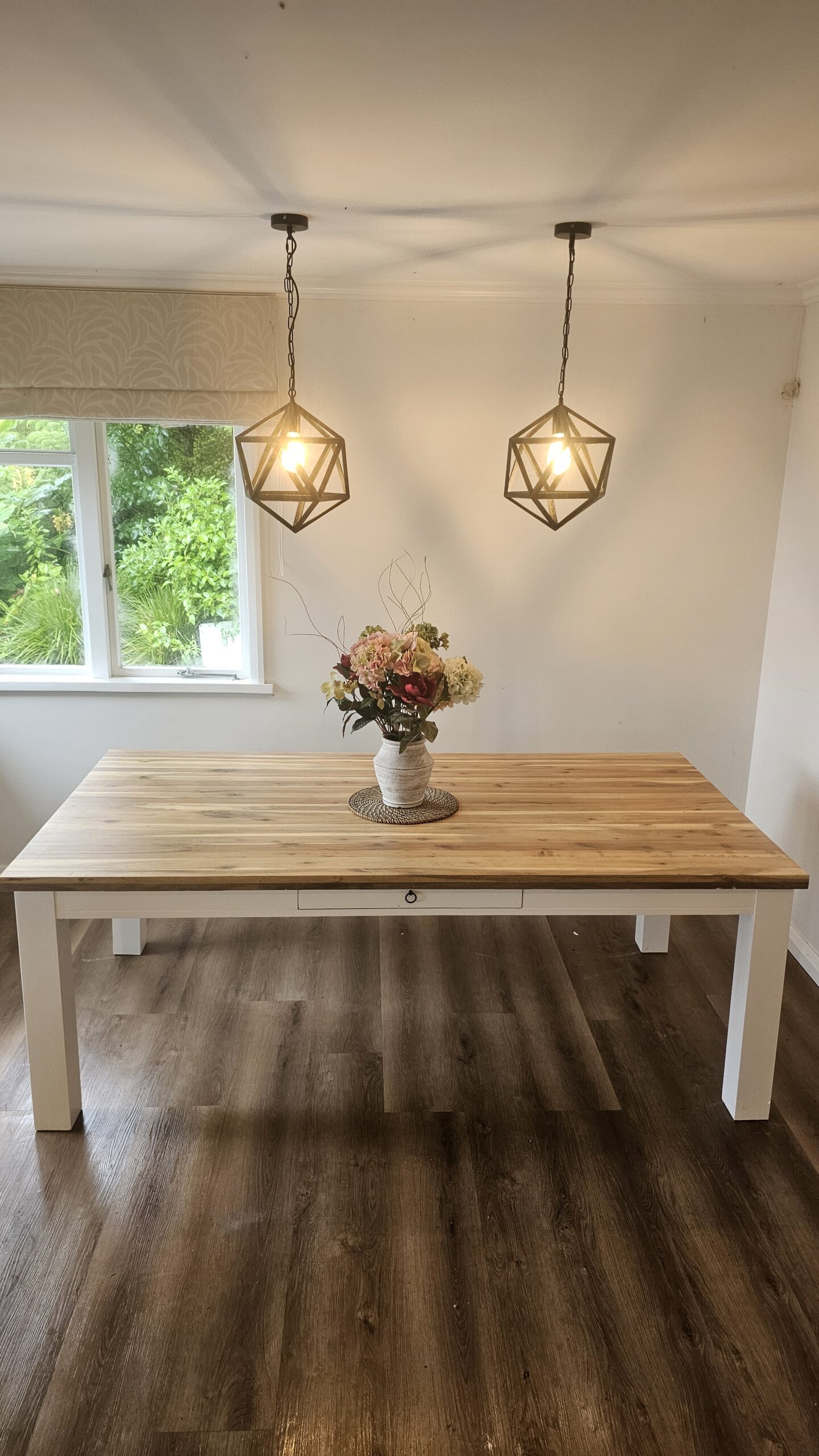 Restored table top back to pine wood with a matt finish varnish. Painted white legs in Dulux Aquanamel. New draw handles installed.